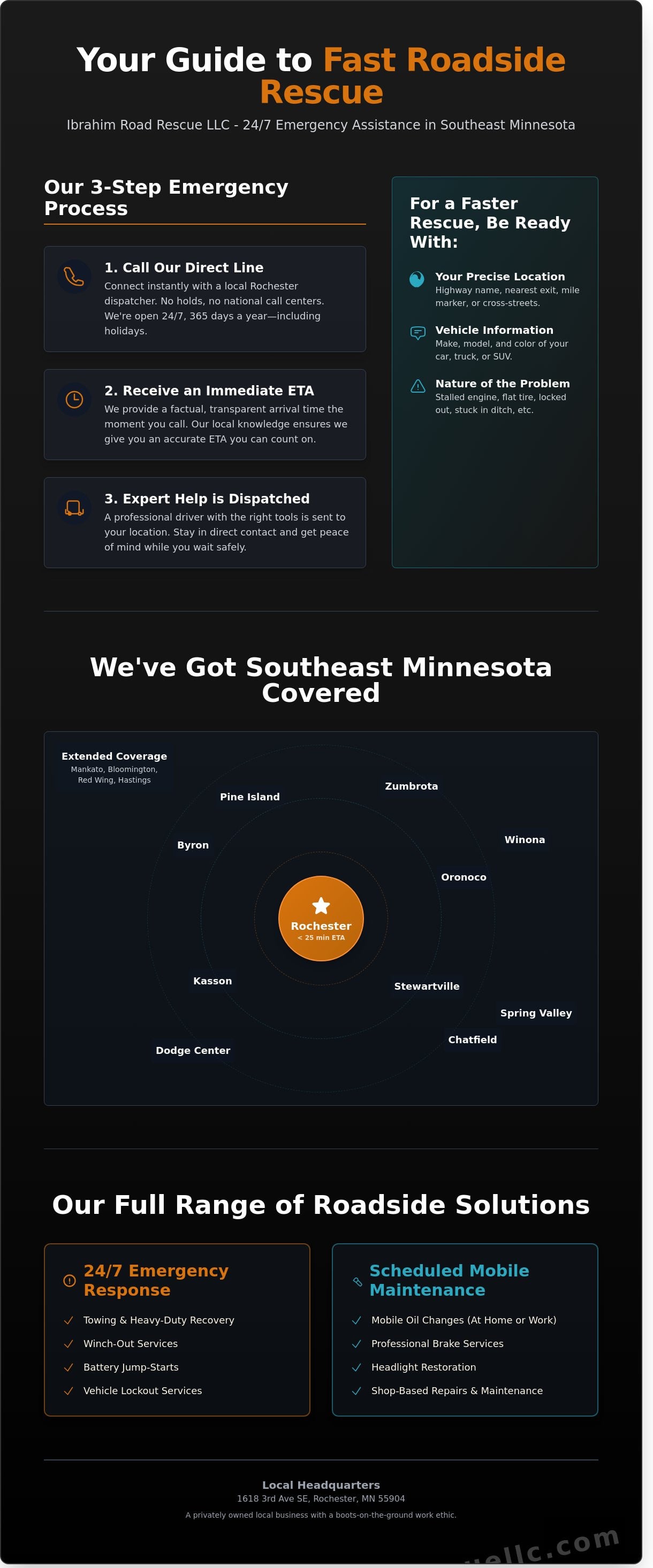 Finding the right Ibrahim Road Rescue contact is your first step toward total peace of mind. Whether you require an emergency winch-out, a jump-start, or scheduled mobile maintenance, our team operates 24/7 across Rochester and 16 surrounding Minnesota cities.