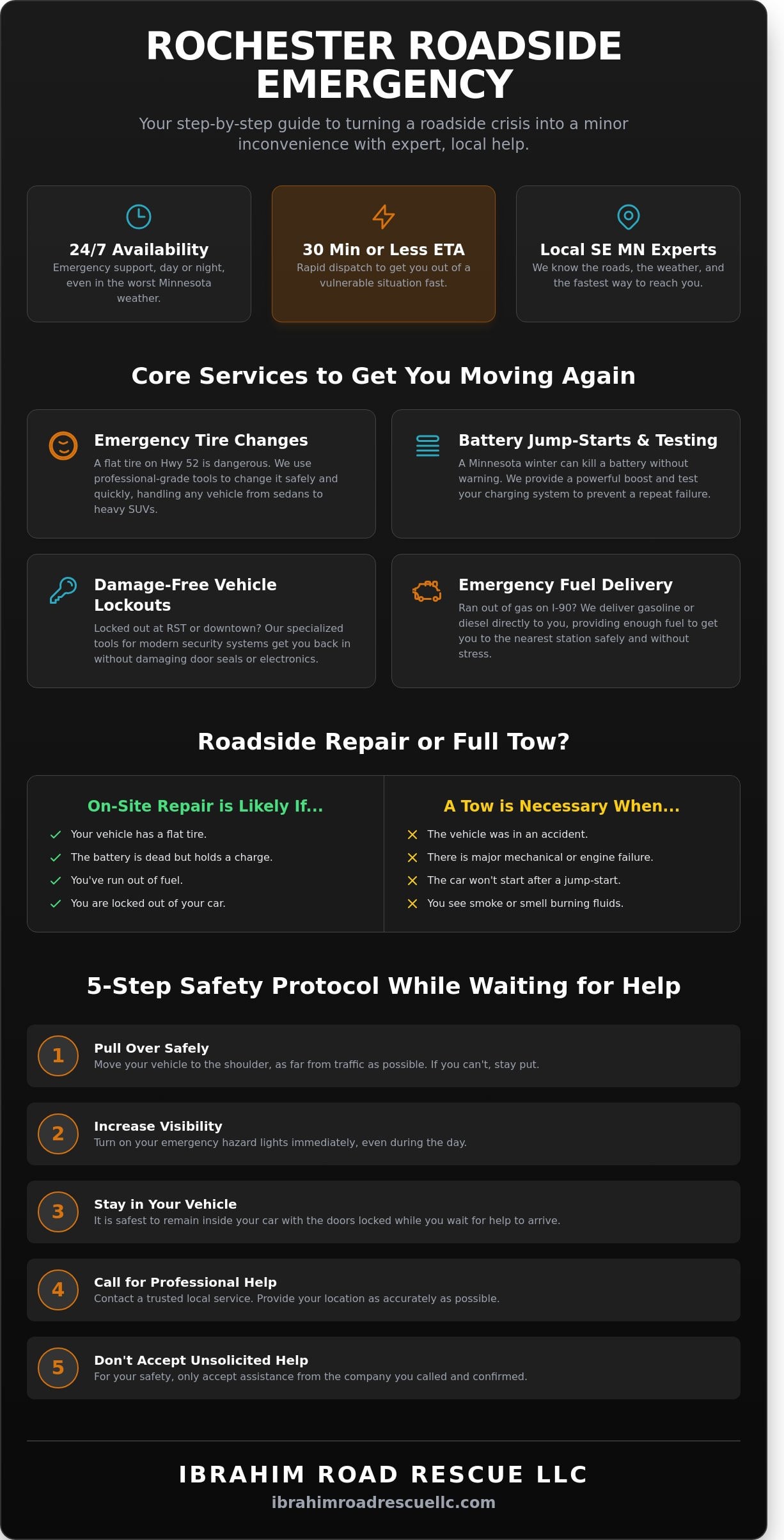 Finding reliable roadside assistance Rochester MN drivers trust starts with your immediate safety. Follow these five steps to stay secure while our technicians head to your location: